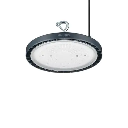 Le Philips Highbay LED BY120P Coreline G5 Aluminium Gris 67W 10500lm 55D - 840 Blanc Froid | IP65 est un puissant luminaire qui est très souvent utilisé pour l’éclairage industriel. Ce luminaire suspendu propage un puissant flux lumineux de 10500 Lm et offrant un excellent rendu de couleurs par rapport aux luminaires traditionnels. Cet high-bay LED est capable de résister aux différentes températures extrêmes que l’on peut retrouver dans les hangars, entrepôts ou autres halls industriels. La technologie LED Intégré sur ce luminaire permet de faire d’importantes économies d’énergie. En effet, l’high-bay propose une puissance de 67W pour un équivalent de W pour les appareils classiques et dispose d’une durée de vie pouvant aller jusqu’à 75000 heures.